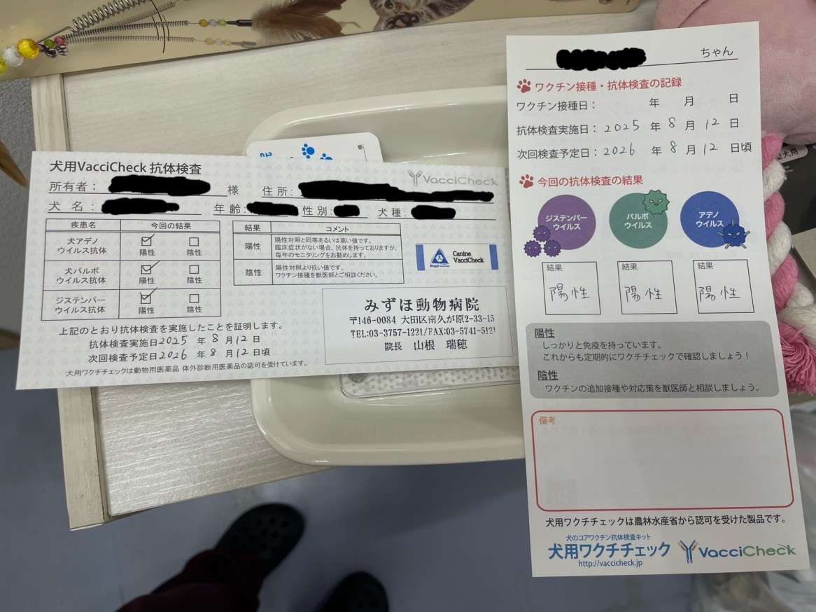 みずほ動物病院では院内でワクチン抗体価検査を実施しているので、当日検査結果をお渡しできます。また、ワクチン接種は体調崩した際の対応を考慮して午前中の接種を勧めていますが、抗体価検査は血液検査なので、時間帯も問いません。