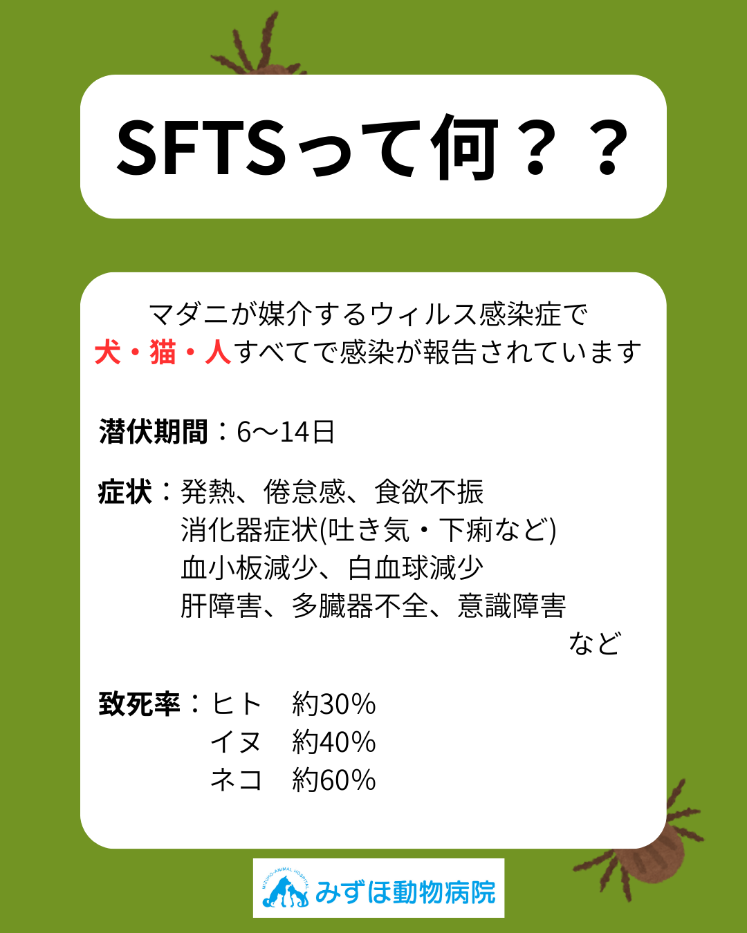 SFTSはマダニの刺咬によって広がる、ウィルス性感染症で、犬・猫・人すべてで感染が報告されている、人獣共通感染症です。(動物を介して人へ感染した報告もあります)